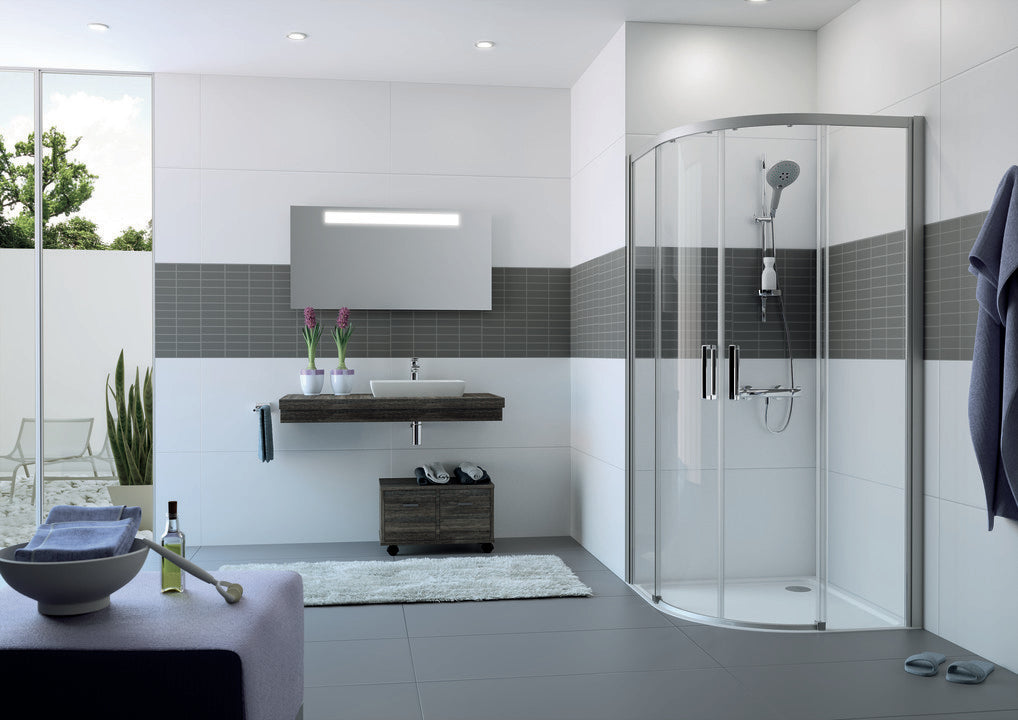 • Částečně orámovaný 1/4-kruhový sprchový kout se dvěma posuvnými a dvěma pevnými segmenty. Dveře se otevírají vždy na jednu stranu