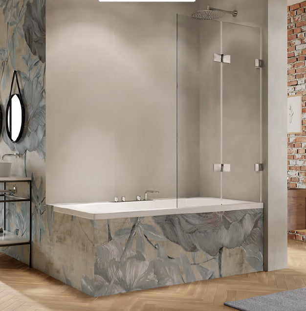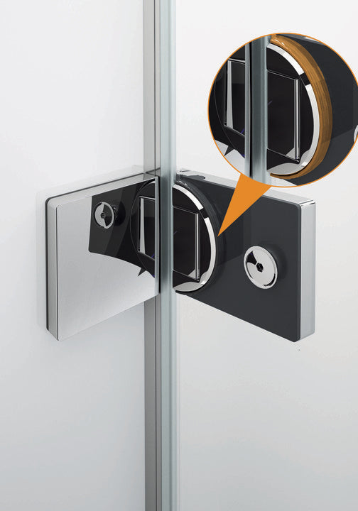 • Frameless folding door with two glass panels, can be swivelled 90° inwards