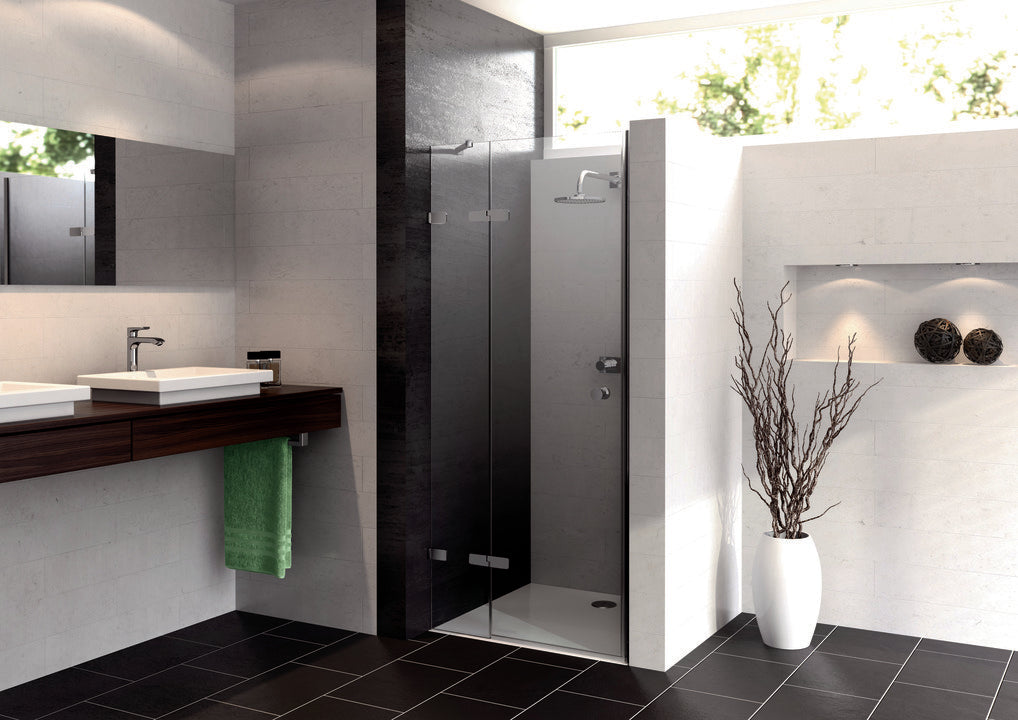 • Bezrámové dveře s jedním skleněným křídlem a jedním pevným segmentem. Dveře se otevírají ven